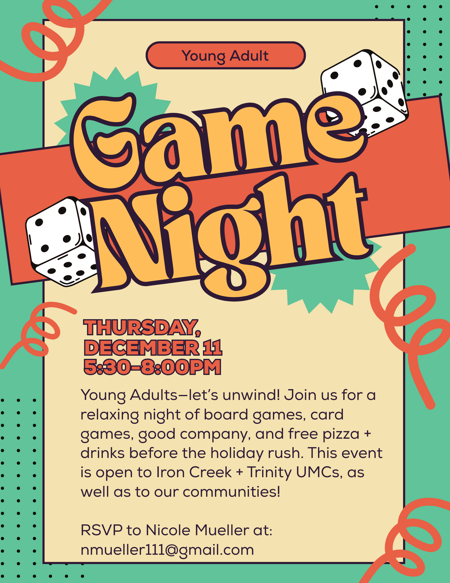 Young Adults—let’s unwind! Join us for a relaxing night of board games, card games, good company, and free pizza + drinks before the holiday rush. This event is open to Iron Creek + Trinity UMCs, as well as to our communities!